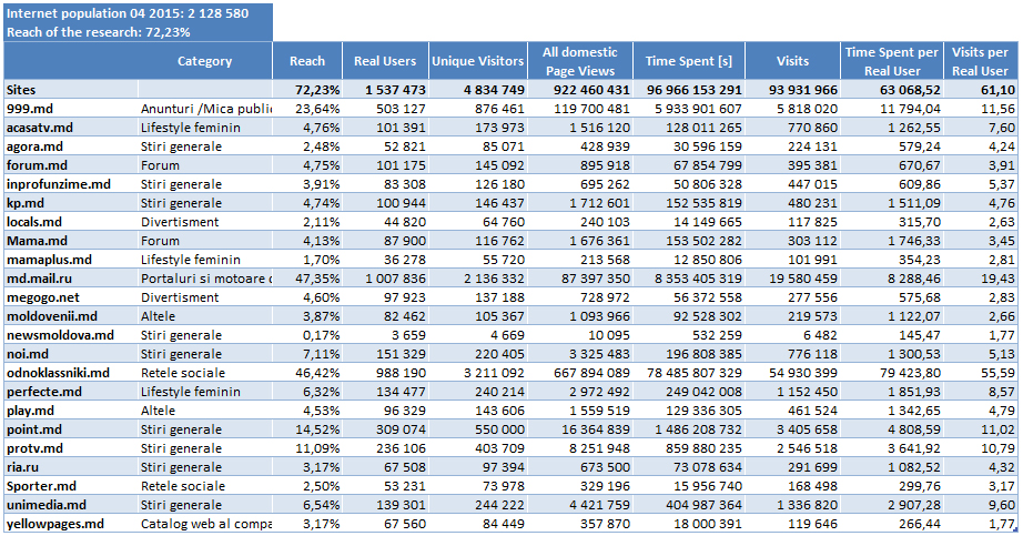 Cu excepția odnoklassniki.md și md.mail.ru, website-urile cu cei mai mulți vizitatori unici în aprilie 2015, înscriși în proiect, au fost: