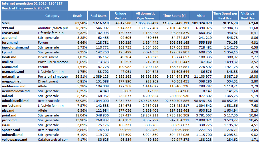 Cu excepția odnoklassniki.md și md.mail.ru, website-urile cu cei mai mulți vizitatori unici în februarie 2015, înscriși în proiect, au fost: