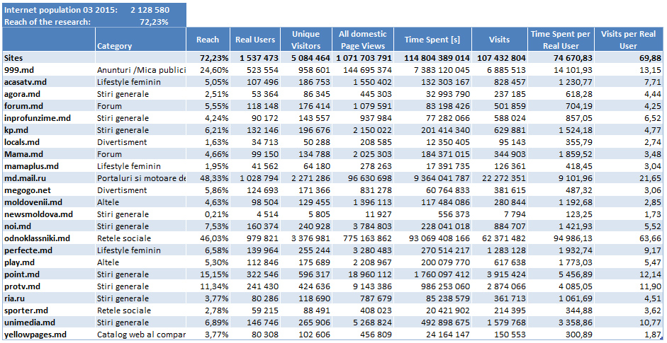 Cu excepția odnoklassniki.md și md.mail.ru, website-urile cu cei mai mulți vizitatori unici în martie 2015, înscriși în proiect, au fost: