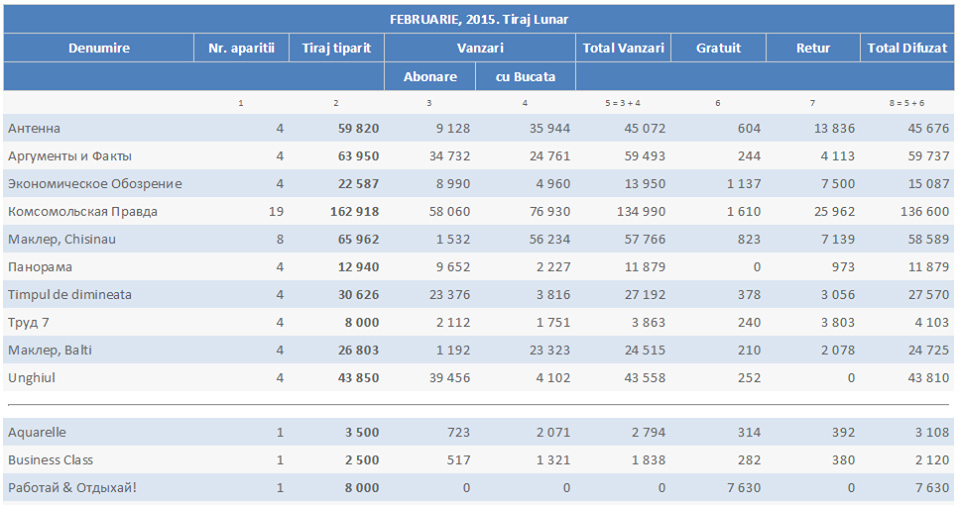 Pentru informație mai detaliată din tabel, descărcați Media pe apariție .xls.